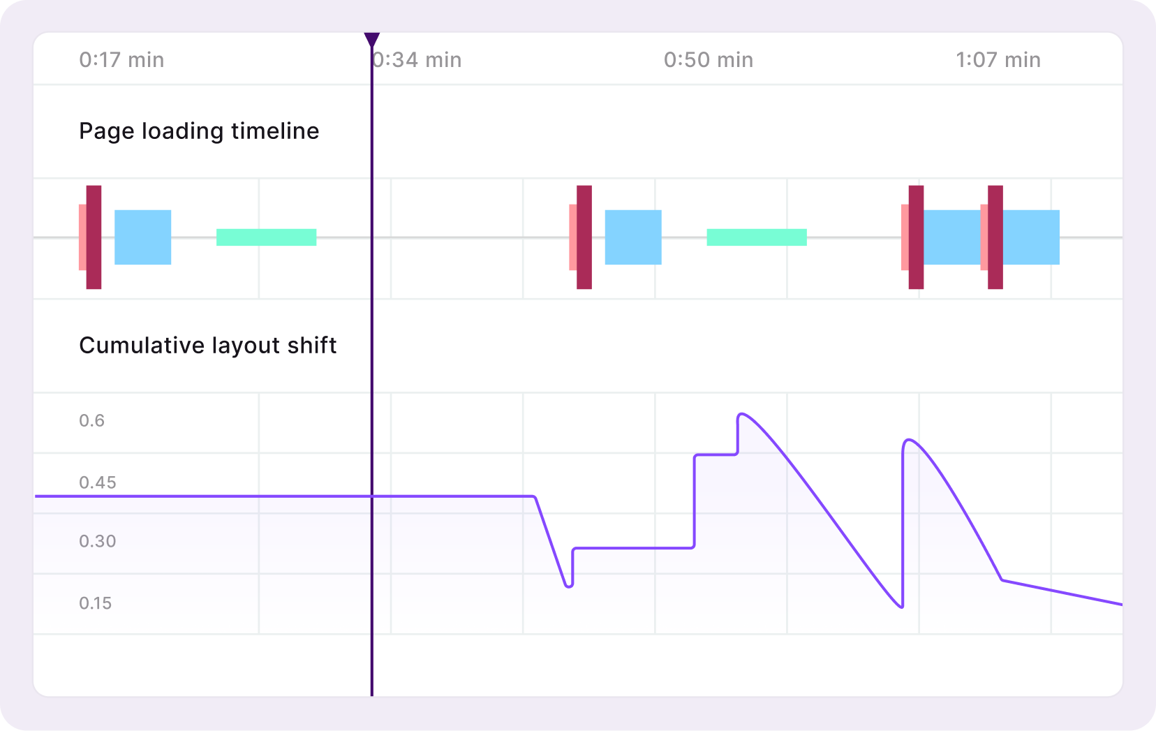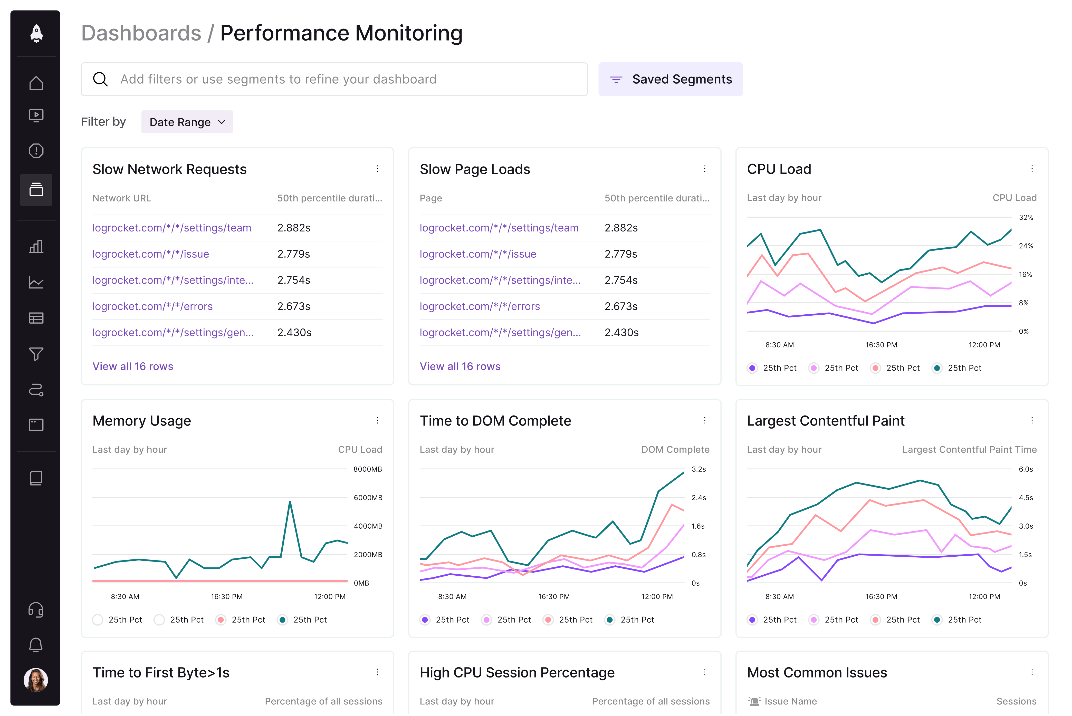 Track core web vitals — largest contentful paint, first input delay, cumulative layout shift, DOM complete, time to first byte, and crashes — at the session or aggregate level.