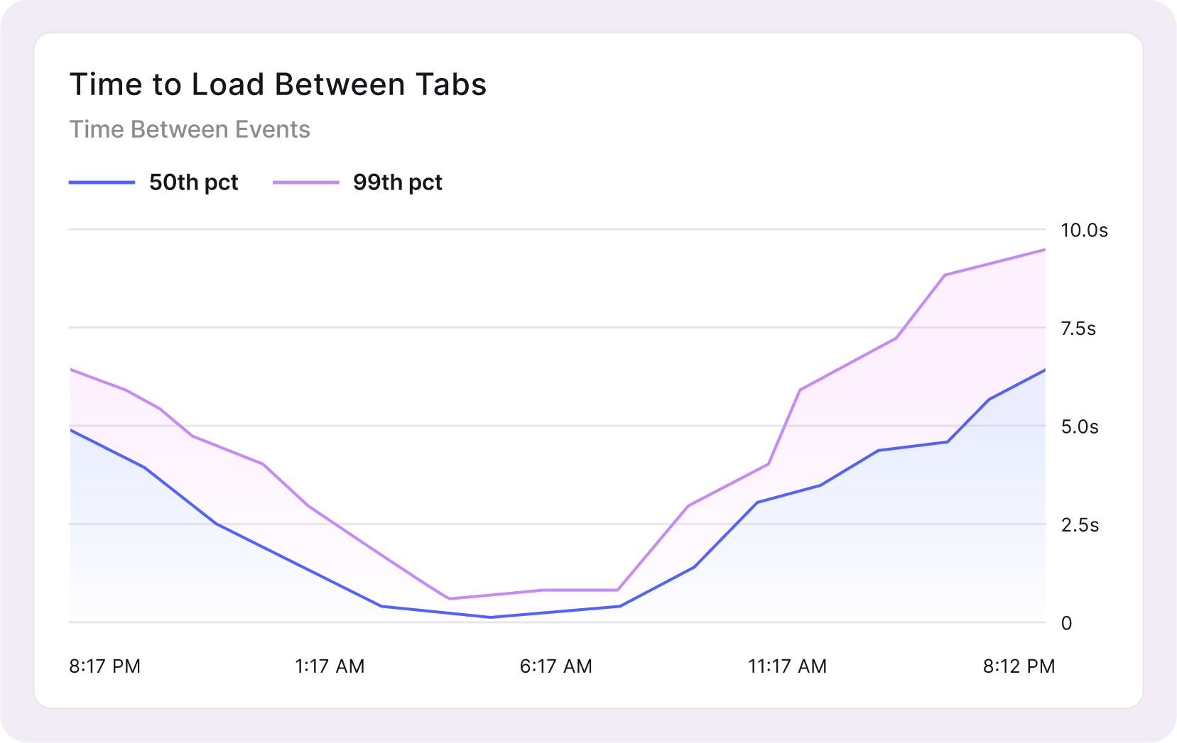 Create charts to track any performance metric on a session, user, percentile, or conversion rate basis. Capture time between events for any two custom events, Redux actions, network requests, or navigation activities.
